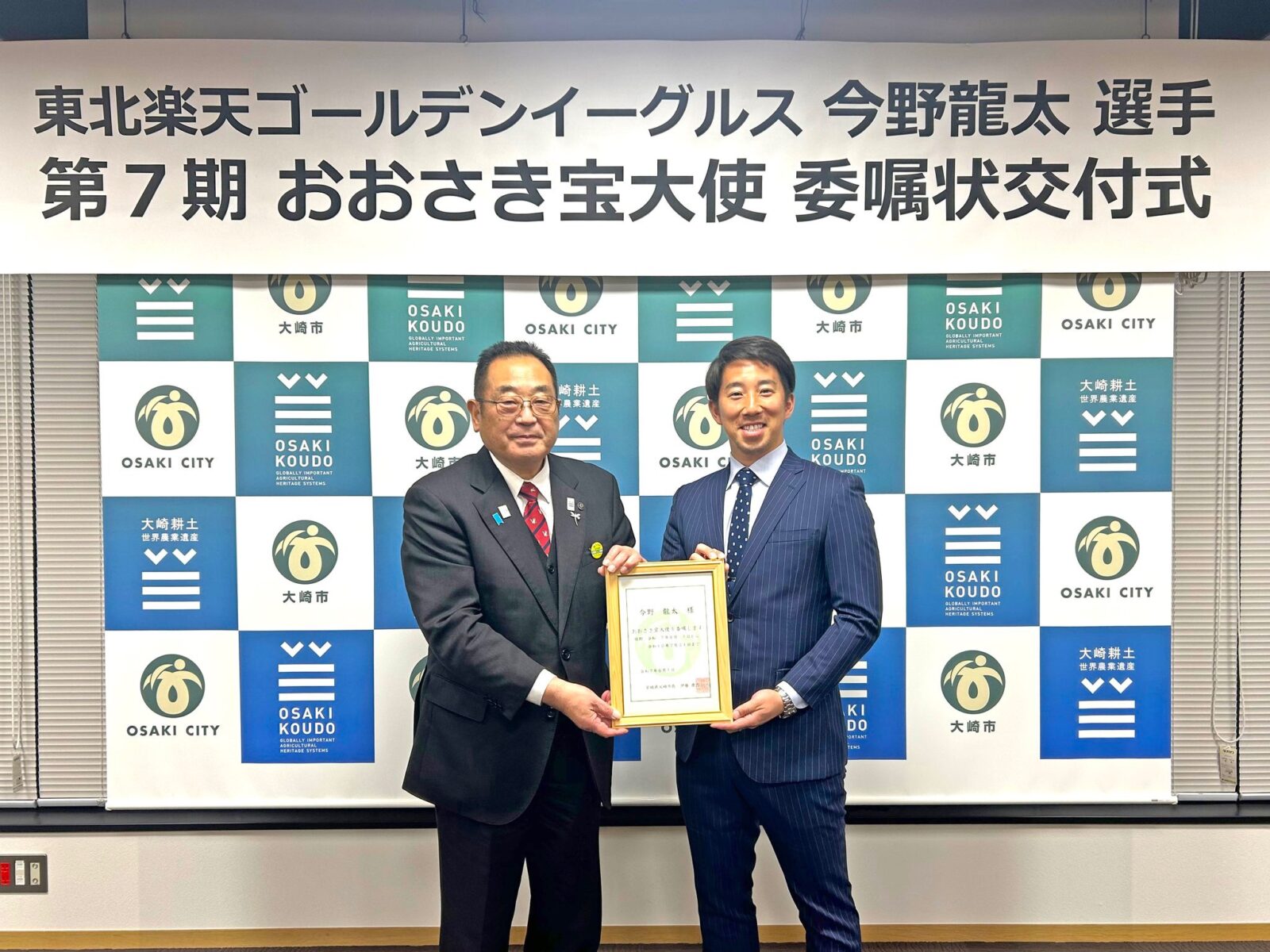 今野龍太選手が地元岩出山のある大崎市の第7期おおさき宝大使に任命され、2026年1月9日(金)大崎市役所にて委嘱状交付式に出席いたしました。
